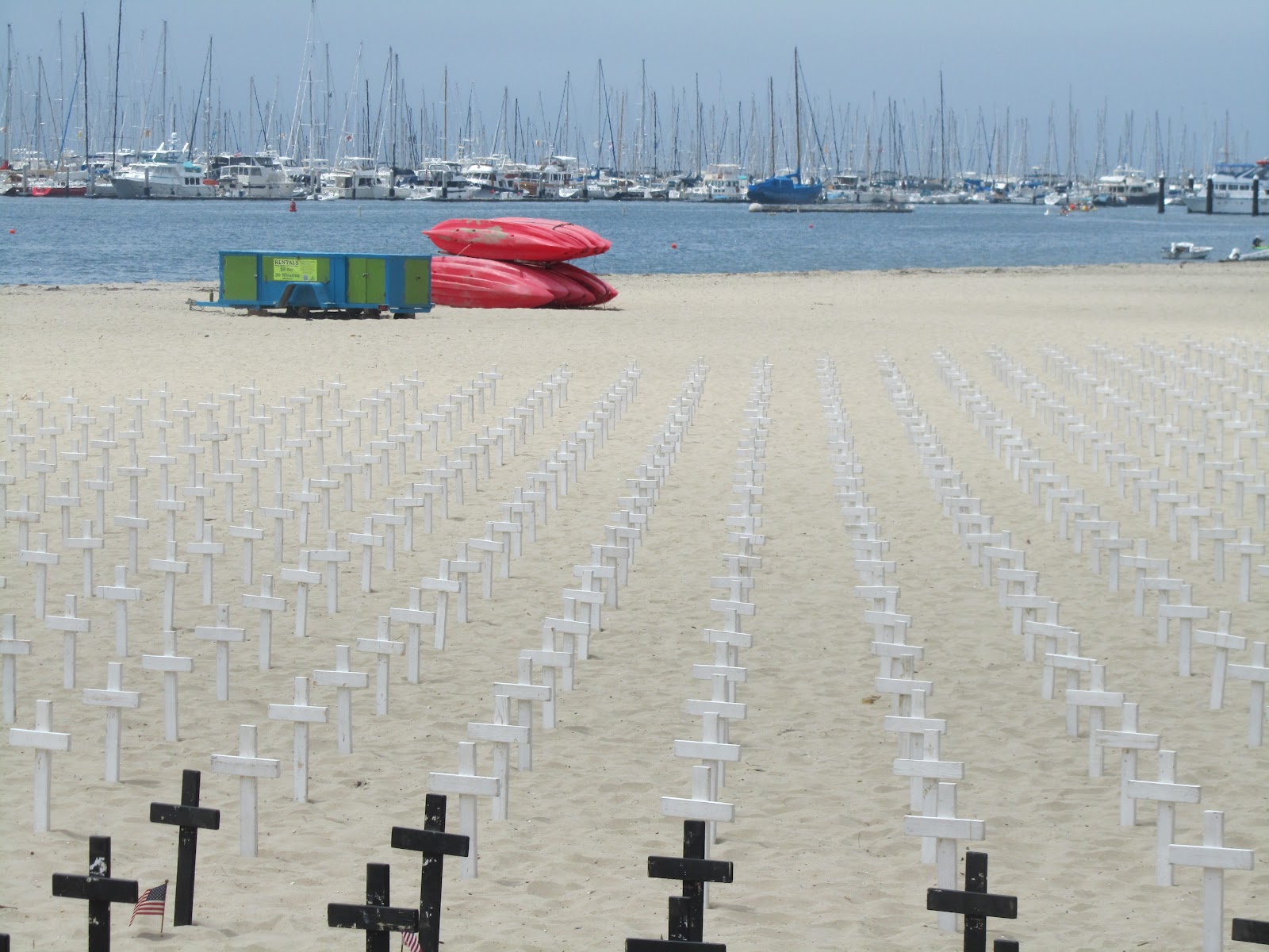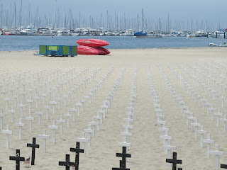 Having the whole day to travel to Monterey we decided to visit Santa Barbara, just across the mountains from Solvang, on the Pacific coast – approx 35 minutes away. We spent a few hours there, travelling around on the Downtown Trolley and walking down by the sea on the wharfe. Santa Barbara is a great place with a slightly Mexican feel to it. It has many nice bars and restaurants, and artists line the water front trying to sell their work. On the beach were thousands of crosses, stuck into the sand and a man shouting out the names of all American soldiers that have died in wars around the world. It was a peace demonstration.