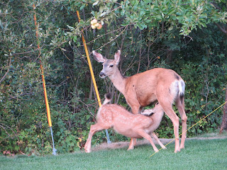 During our BBQ we chatted to our host and suddenly, out of the trees came a doe (…a deer, a female deer..) with its fawn. They slowly made their way onto the lawn area and the doe started picking apples from the trees while the fawn fed from its mother. They were only a few feet away and were quite contented and unafraid.