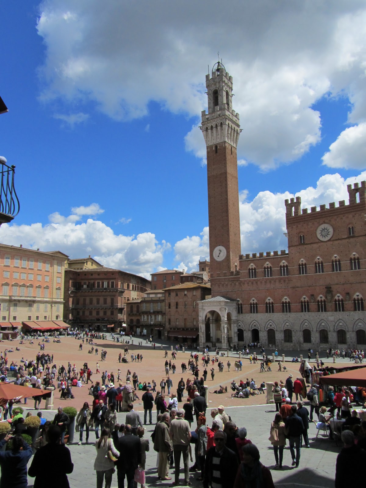 We entered the Piazza del Campo down a long, narrow flight of steps and the explosion of space and sound was exhilarating as we descended the last step. Across the fan-shaped expanse , the Torre del Mangia – the second tallest bell tower in Italy – dominated the scene.