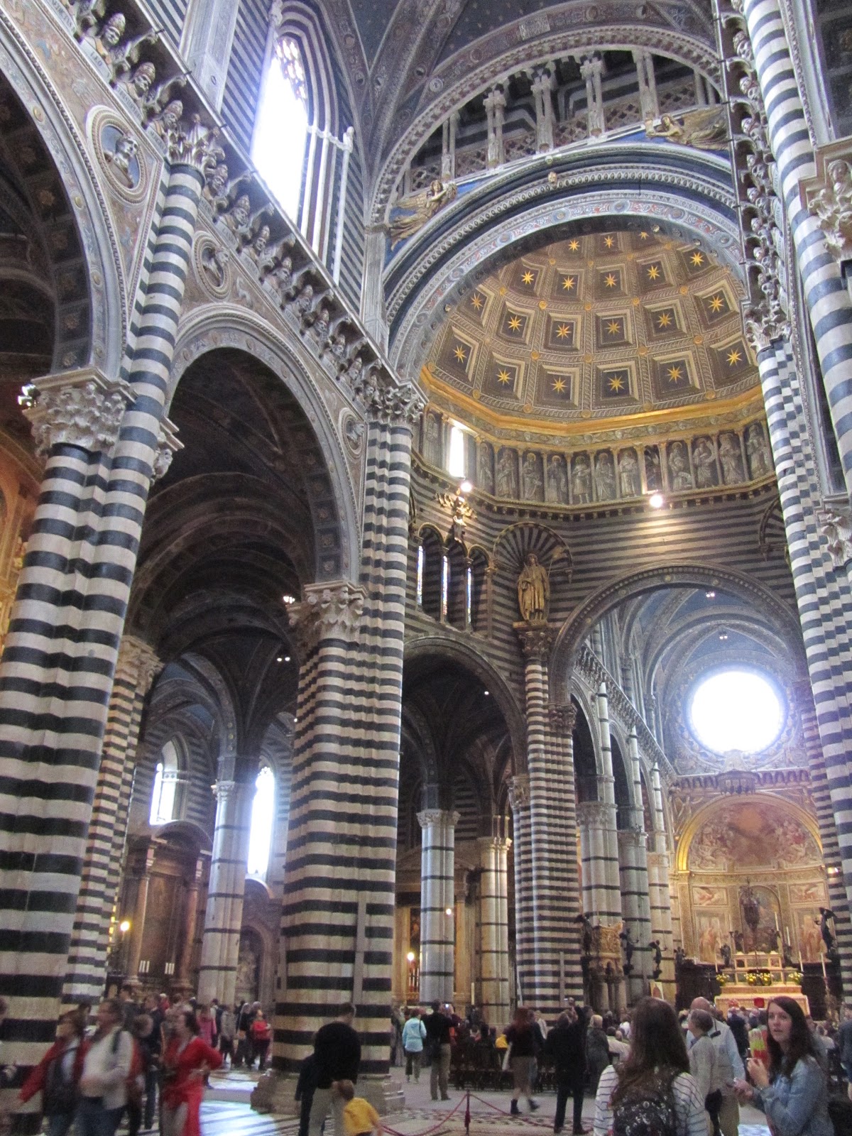 Refreshed, we headed for the Duomo. It was only four Euros each to enter and it was the first time we felt we would have paid more: the interior, like the exterior, certainly had the wow factor. Its Gothic style and black and white marble made it different from anything we had seen before. The attention to detail was quite breathtaking. There was, however, a very repetative, monotone “No flash” coming from the many officials keeping watch. There were countless arguments between couples trying to work out how to disable their camera flash!