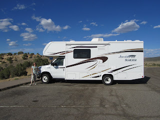 Yet another early start, but after a chilled-out time in Denver we were quite fresh. We had muffins and Starbucks in the taxi to Aurora, where we were to pick up the RV. Becuase this was RV Day (D Day in military speak!): the bit we were sort of dreading – driving something the size of a bus across stark desert on the wrong side of the road for 8 hours! So, with some trepidation, we arrived at the Apollo RV rental centre and there waiting for us was our RV – all gleaming white and new. First impression was that it was not quite as big as we had imagined (in our nightmares) so we relaxed a little. After the paperwork we had to sit through a video which told us everything we needed to know (so they said). Then we had to inspect the vehicle and the guy showed us all the bits and pieces – basically, all the things that could go horribly wrong – just what we needed! One thing we latched onto immediately was that if you don’t turn the propane gas knob to the off position when putting fuel in the RV you can be incinerated and burned to a crisp – I made a note of that one on the edge of my USA Today! Before we left we were given the opportunity to buy various things – a stack of toilet paper – ‘special’ RV paper. We took two packs just in case. Two bottles of spray to clean the toilet and sink plugs as things “can get a bit smelly” without that. You can see there’s a bit of a toilet theme developing here. Maybe more of that later. We turned down the BBQ and the camping lamp (we regretted leaving the lamp later on). Oh, and we hired the GPS (or Sat Nav as the Brits say).