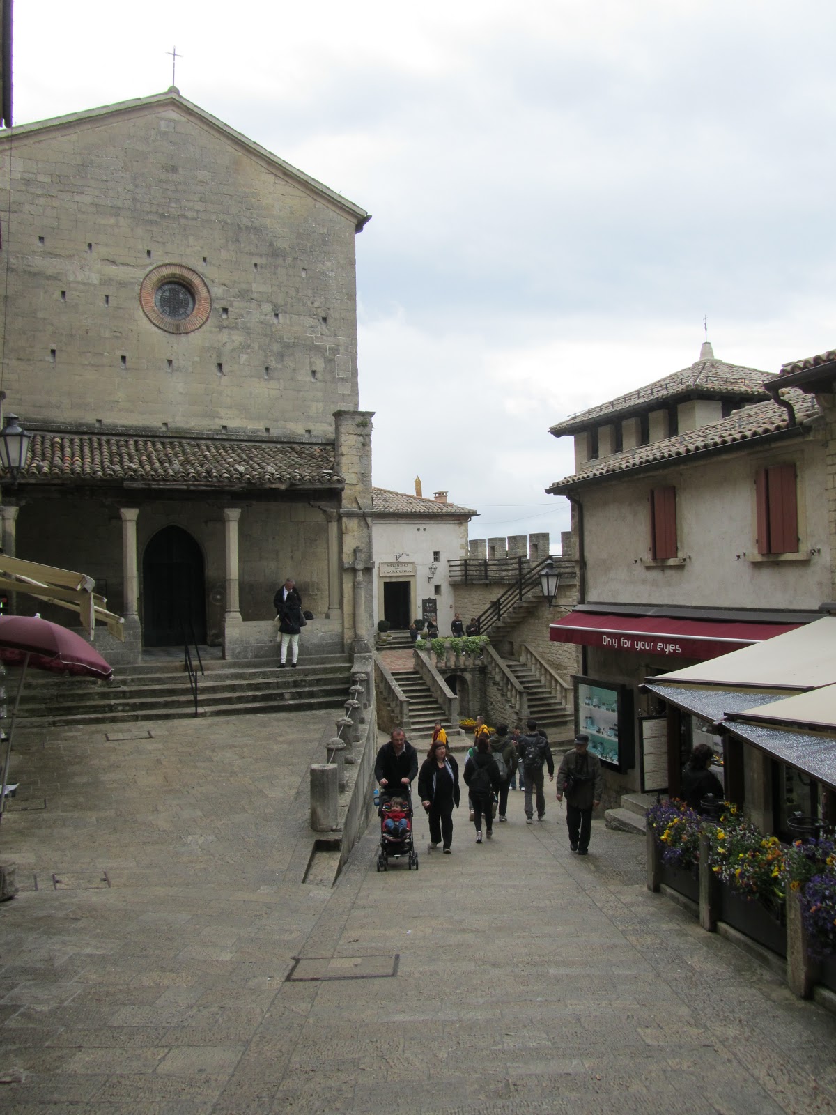 Later we ate in a lovely restaurant on the edge of the cliff overlooking the great expanse of land between us and the Adriatic Sea. On leaving the restaurant we noticed how quiet it had become. The streets were deserted, the shops closed. San Marino had become a ghost town. We headed back to the car and started our journey home, after one last look at the distant mountains in the late evening sun.